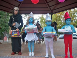 Mucho arte es lo que también hubo en los concursos de disfraces. Este año el nivel ha sido altísimo en el infantil. Los padres se lo han trabajado mucho, y es que un elevado número de disfraces estaba hecho totalmente a mano y fabricado con imaginación. Los ganadores fueron Los prehistóricos, Los Pitufos y los juguetes Lego. En cuanto a los participantes adultos, no se quedaron atrás. Sobre el escenario se vio hasta una actuación musical. Massiel vino a visitarnos. Una divertida concursante la imitó versionando a su manera el La, la, la. Tanto la graciosa letra que compuso como su coreografía provocaron las carcajadas del público. Quedó en cuarto lugar. Las terceras fueron unas elegantes chicas que representaban la moda de diferentes épocas; la Grecia clásica, los años 50, la etapa más elegante que vivió París… La boda más aterradora la representaron los segundos clasificados, que lucían los trajes nupciales con rostros que daban miedo. Y si los Lego pequeños se llevaron un premio, también lo hicieron los adultos. El primero, y muy merecido. Un grupo de pardeños fabricó con papel, cartón y plástico estas tradicionales fichas en versión gigante y se pasearon dentro de ellas con tanto desparpajo que causó gran expectación.