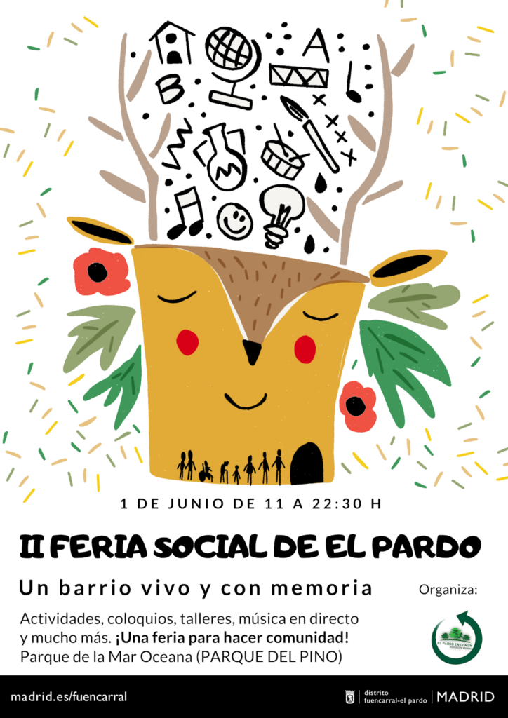 El sábado 1 de junio se celebrará la segunda edición de la Feria Social de El Pardo, una iniciativa de la Asociación Vecinal El Pardo En Común (antiguo Foro Ciudadano de El Pardo) que, como dicen sus responsables, tiene como fin “hacer comunidad. Crear un espacio para construir un barrio mejor desde lo cotidiano, desde lo que nos hace ser pardeñas y pardeños, desde lo comunitario”.