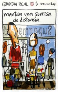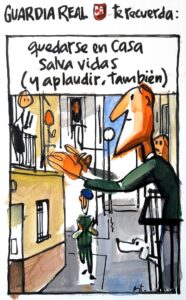Durante los primeros días, vimos en las noticias imágenes de los guardias desarrollando su labor lejos de sus ámbitos habituales de actuación (en El Pardo). A partir de ahora, también les podemos ver en dibujos. Y es que, cada día, el humorista gráfico José Manuel Esteban está ilustrando los distintos trabajos que desarrolla la Guardia Real acompañados de un consejo.