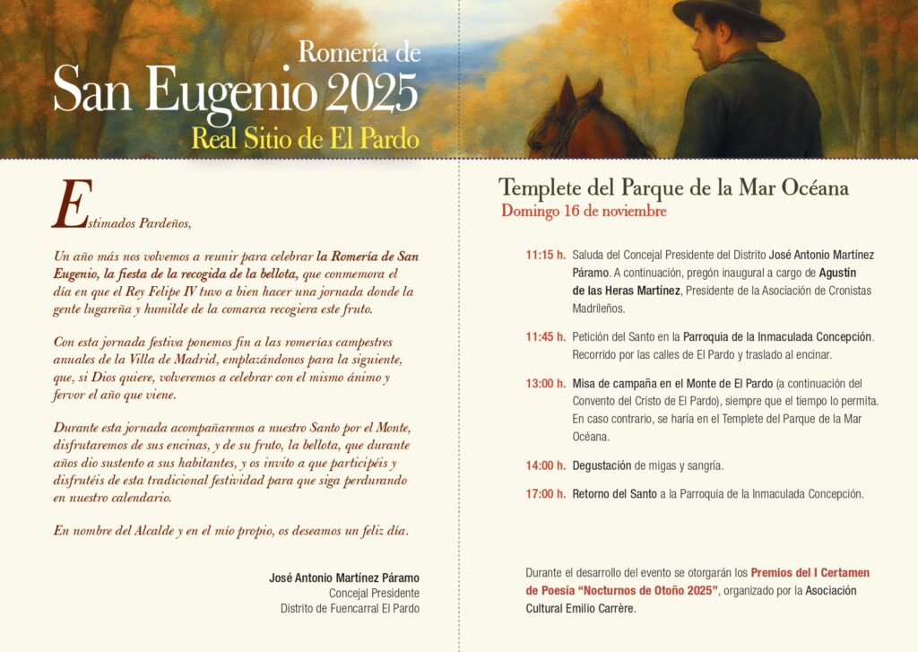 El domingo 16 de noviembre, de nuevo, serán los cofrades y los romeros, vestidos de goyescos, sus principales protagonistas. A las 11.15h. se reunirán en el templete del Parque de la Mar Océana para escuchar el pregón, que este año correrá a cargo de Agustín de las Heras Martínez, presidente de la Asociación de Cronistas Madrileños. A continuación, la Asociación Cultural Emilio Carrère entregará los premios de su I Certamen de Poesía ‘Nocturnos de Otoño 2025′. Finalizado el acto, los romeros pedirán la imagen de san Eugenio en la puerta de la Iglesia Virgen del Carmen a los cofrades y recorrerán las calles pardeñas con ella. Después, la trasladarán, en romería, hasta el encinar más cercano al Convento del Cristo. Allí, a las 13h., se celebrará una misa de campaña, si el tiempo lo permite. Si no es así, se oficiará en el templete. Concluida ésta, aproximadamente a las 14h., los romeros, cofrades y todo el que lo desee degustarán migas y sangría, y bailarán danzas populares. A las 17h., la Romería de San Eugenio terminará con el traslado del santo a la iglesia.